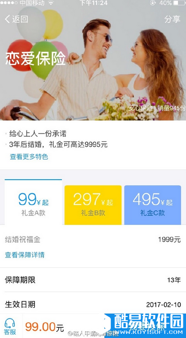 该保险由安心保险提供,有99、297、495三款,三年后结婚,分别可获赔1999元、5997元和9995元。 不过这跟之前投保送玫瑰的套路一样,保险公司基本不会赔钱的。 所以按99元和1999元对比的话,平均20对情侣最多1对结婚,保险公司才能保本。换句话说,情侣结婚成功率不足5%。 支付宝恋爱保险在哪里? 打开支付宝-我的-保险服务-财产,里面有: