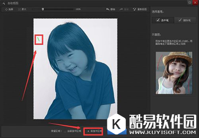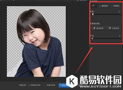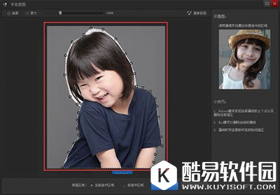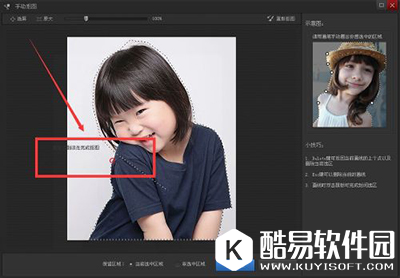 第二种方法:手动抠图。 点击”手动抠图“后,我们会进入一个工作界面,鼠标在工作区内会变成一支笔,需要我们手动选取需要抠出的图片,选中后点击”确认选区“,然后点击确认即可,同上,我们可以在右侧工作区做一些局部调整