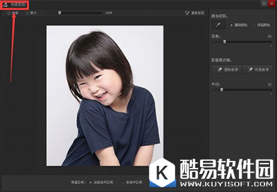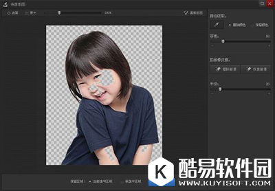 第四种方法:色度抠图。 点击”色度抠图“后,进入工作界面,鼠标在工作区内会变成一个取色器,在我们不需要的背景处,鼠标左键单击一下,即可删除我们不需要的背景,有时会出现一下偏差,需要我们在右侧工作区的”容差“中调整