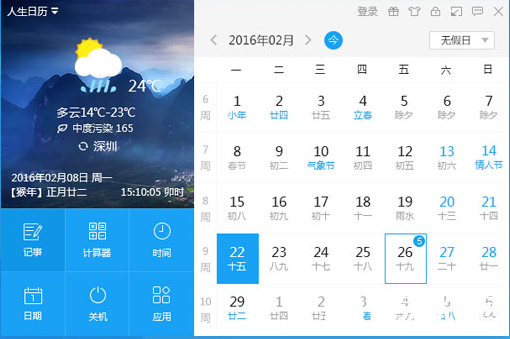 软件简介 人生日历是一款很好用的桌面日历工具,提供万年历查询、农历查询、天气预报、24节气查询、节假日查询、黄历查询、放假安排、自动校对时间、订火车票等生活化的功能,可以帮助用户便捷的查询各类生活信息。其界面设计清新简洁,支持自由换肤,在细节方面的设计处理十分贴心。 软件界面很漂亮,默认设置为透明效果,还可以换肤,还可以网络校时,功能很实用,支持自由换肤,界面超酷,操作简单,小巧不占用系统资源。