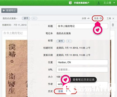 注意: 1. 废纸篓中笔记被彻底删除后,笔记将无法找回; 2. 共享笔记本笔记被删除后,会进入共享笔记本创建者的废纸篓中; 3.私人笔记删除后进入私人笔记废纸篓;企业笔记删除后会进入企业版废纸篓,只有企业管理员可以将这些笔记从废纸篓中永久删除。 单条笔记恢复到历史版本:点击笔记右上角[i]----查看笔记历史版本记录; 1、在Windows和Mac电脑客户端,或登录印象笔记网页版,打开笔记,点击笔记页面右上角按钮“i”信息— 查看笔记历史版。