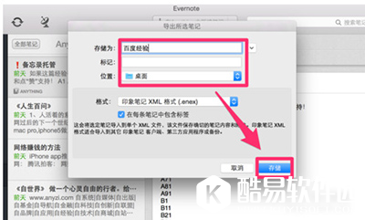 4、此时弹出来的小窗口为导入笔记的相关设置页面,在存储为栏目中输入自己想要保存的文件名称,在位置栏目中选择想要保存的路径,然后点击右下角的“存储”按钮完成笔记的导出操作。