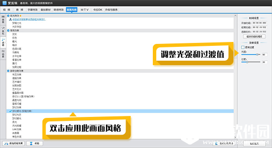 2、在视频预览框中,将时间进度条定位到透明式淡入淡出开始的画面(可通过上下左右方向键精确踩点),鼠标双击“画面风格”的“滤镜”列表的“梦幻辉光”、“梦幻光芒”或“曝光”(三种效果任选其一),在弹出的“选取风格时间段”对话框,点击“开始时间”后的时间拾取小按钮,获取当前画面时间点,然后通过下方向键,向后逐帧移动画面,直到淡出画面消失,即“梦幻辉光”或“梦幻光芒”等适合结束的位置,点击“结束时间”后的时间拾取小按钮。一般来说,“梦幻辉光”或“梦幻光芒”等效果的持续时间在0.5秒到1秒左右效果最佳。