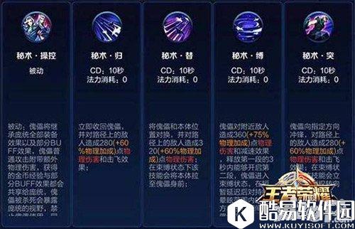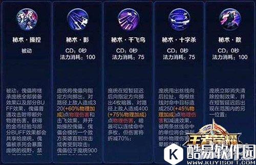 被动技能:秘书·操控——傀儡将继承庞统全部装备效果以及部分BUFF效果,傀儡普通攻击附带额外物理伤害,获得的金币经验与部分BUFF效果都会共享给庞统,傀儡被杀死会暴露庞统的事业,禁止傀儡使用,同时对庞统造成眩晕;每当傀儡回归本体,本体都会清除控制效果并获得一个短暂的加速效果和护盾 1技能:秘书·影——庞统将傀儡向指定方向掷出,对路径上敌人造成伤害和击飞效果,并开始操控傀儡,傀儡会模仿一个敌方英雄直到攻击或者受到攻击;傀儡位于庞统900范围内时庞统会进行自动攻击;傀儡超过庞统2500范围5秒后会自动销毁;傀儡一旦死亡或销毁控制权将立即转回庞统本体身上 解析:在释放时傀儡会易容成一名敌方英雄,避开敌方的攻击,同时这2500范围距离远到可以让傀儡强推塔了,傀儡一旦死亡或销毁回岛本体时还能获得加速和护盾 2技能:秘书·千飞鸟——庞统在短暂延迟后向指定方向投掷出4枚暗器,对路径上敌人造成物理伤害,暗器可以连续命中多枚,但伤害将折减70% 解析:庞统的输出技能,能对路径上的敌人造成伤害,命中多枚暗器会造成伤害折减 3技能:秘术·十字杀——庞统甩出丝线向后拉扯,每根丝线对命中目标造成物理伤害和减速效果,被两条丝线命中的单位将受到额外的物理伤害和晕眩效果 解析:团站中强力的控制技能,可以留住要逃走的英雄,造成伤害的同时带来减速效果,同时命中两条丝线还能造成额外的伤害褐晕眩效果 4技能:秘术·散——庞统立即消失清除控制效果,并在短暂延迟后出现在范围的另一个位置 解析:庞统的唯一+净化技能,这简直等于携带多了一个召唤师技能呀!