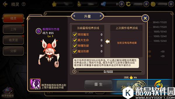 【精灵升星】 最后一点要提升的就是精灵的星级了。精灵升星能够提升精灵技能效果,获得全属性加成同时还能获得额外的属性加成。想要对精灵升星就需要使用精灵升星药水对精灵进行培养,每培养一次可获得100点培养值,当培养值满了便能升星了。精灵每培养一次可获得额外的攻击,最大生命,物理防御和魔法防御加成,至于具体提升哪个方面则是随机的。当然玩家也可以自己设置只获得两种或者三种属性的加成,不过是需要额外龙币的,土豪的话可以无视,平民玩家的话还是老老实实看运气吧。上面我们也已经说过,极限阿尔杰塔的攻击资质和最大生命资质较高,所以在精灵培养方面,尽量提升攻击和最大生命加成。如果对随机的加成属性不满意,我们完全可以让精灵重生重新进行培养,重生可是会返还培养使用的精灵药水的哦。