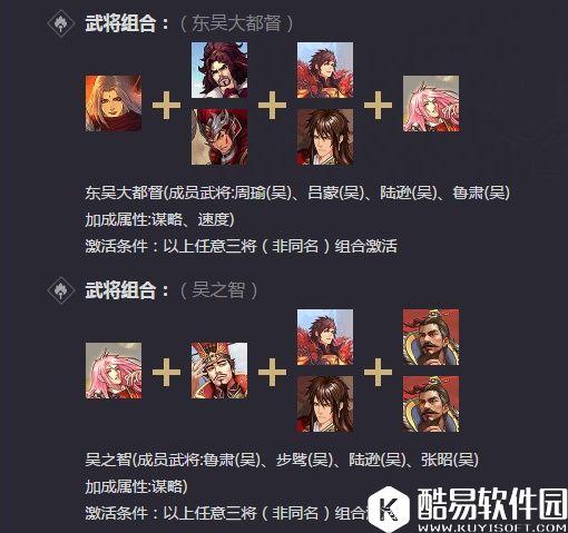 历任吴国大都督、上大将军、丞相。与吕蒙一起在荆州大败关羽;在夷陵用计大败蜀国大军;并几乎将魏国对吴国的侵略全部抵御,可谓居功至伟。 武将组合:(东吴大都督) 东吴大都督(成员武将:周瑜(吴)、吕蒙(吴)、陆逊(吴)、鲁肃(吴) 加成属性:谋略、速度) 激活条件:以上任意三将(非同名)组合激活 武将组合:(吴之智) 吴之智(成员武将:鲁肃(吴)、步骘(吴)、陆逊(吴)、张昭(吴) 加成属性:谋略) 激活条件:以上任意三将(非同名)组合激活 基础战法: 火势风威:1回合准备,对敌军全体发动策略攻击(伤害率55.5%,受谋略属性影响),并使其在受到下一次伤害时,会额外引发一次猛烈火攻(伤害率110.5%,受谋略属性影响)可拆战法: 十面埋伏:1回合准备,对敌军全体发动一次策略攻击(伤害率65%,受谋略属性影响),并随机使敌军单体下一回合造成的所有伤害大幅度降低(受谋略属性影响)武将解析: 吴国大都督核心武将之一,S2吴国限量武将,输出技能伤害高,属性成长丰满,是一个非常优质的武将。常用于拆解【十面埋伏】。 玩家推荐武将定位1:输出 推荐武将搭配:“称号阵容” S2陆逊+周瑜+吕蒙 推荐战法:不攻+十面埋伏 推荐加点:谋略 玩家推荐武将定位2:输出 推荐武将搭配:“称号阵容” S2陆逊+鲁肃+吕蒙 推荐战法:深谋远虑+楚歌四起 推荐加点:谋略