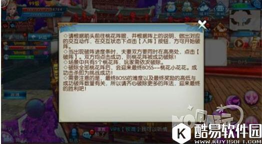 二、具体流程 ①沿路标入第一阵,沿路径进入黄色光圈。 ②进入阵中,按照规定要求夫妻做出交互动作壁咚、依偎、抱起等,界面上出现"入阵"选项。 ③点击"入阵",系统出现像钓鱼一样的进度条。夫妻同时在高亮区域点击"破阵",则第一方位的阵破,五阵完成五分之一。 ④按照系统标记路线,依次对第二,第三,第四,第五个方位的法阵进行破解。破阵方法与第一阵相同。唯一不同的是每一个阵法入阵所夫妻交互动作不同。 ⑤五阵破掉之后,阵法的尽头就是终极boss桃花小花花 (小编内心os:名字谁起的,这是个boss名?) 难度不大,夫妻合力搞死。