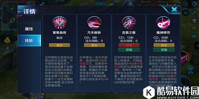 被动技能:饕餮血统 解析:被动技能增加了吕布的普攻距离,再加上附魔状态下的真实伤害使得吕布拥有比其他更高的伤害以及更长的攻击距离,,并且附魔状态下攻击敌人还可以回复自身生命值,大大提高了吕布的生存能力。