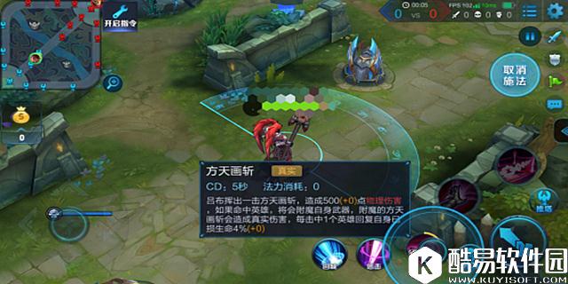 一技能:方天画斩 解析:对目标方向一个呈180°的扇形范围内的敌人造成物理伤害,如果成功命中敌方英雄,将会进入附魔状态,附魔状态下的一技能以及被动技能都会造成真实伤害,命中敌人还会回复生命值,并且命中得越多回复得越多,可以说一技能的存在就是吕布能够以一敌多的资本,但是需要注意一点,如果一技能没有命中敌方英雄将会立刻失去附魔效果,所以一定要保证一技能的命中率。