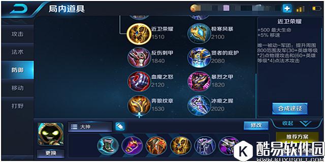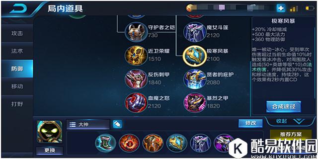 第一件出抵抗之靴是为了减少自身的控制时间,增加自己的移动速度,好为其他路的队友进行支援 进化水晶是为了平稳的度过前期,因为这件装备在在升级时可以恢复一部分的血量以及蓝量,在满级的时候建议出售并更换一件不死鸟之眼。 红莲斗篷和近卫荣耀是提升自己的输出以及队友的输出,而且红莲斗篷所提供的抗性和血量都是不错的 魔女斗篷可以提供一个吸收魔法伤害的护盾,可以有效的减少对方法师对你的消耗,这件装备很有效的抵挡法师的伤害 而霸者重装在脱离战斗时可以提供一个可观的生命回复,再配上前面更换的不死鸟之眼,在脱离战斗时可以比较迅速的回复血量 逆风出装:抵抗之靴 不死鸟之眼红莲斗篷极寒风暴魔女斗篷霸者重装