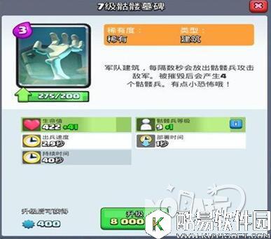 卡牌分析: 骷髅墓碑是目前较为热门的一个防守骚扰建筑,这张卡牌在费用上非常的灵活,只需要3费,并且由于可以源源不断的产出小骷髅,同时墓碑消失后还能够产出4个小骷髅,所以无论是用于骚扰还是防守都较为好用,在对抗一些移动速度较慢的肉卡时有很好的解卡性。 克制卡牌: 巨人/石头人/迷你皮卡/野猪骑士等,骷髅墓碑的优点在于可以源源不断的召唤小骷髅进行输出,所以在对抗一些单一输出的卡时有着很大的优势,并且在防守一些攻击目标为建筑的卡牌时,也是能够利用较多的小骷髅来快速的防守。 骷髅墓碑与加农炮对比: 血量和时间: 在血量和时间,这两张卡的差距还是蛮大的,首先血量方面7级的骷髅墓碑有着422的血量,这个血量是有些较低的,而9级的加农炮则是742点,所以在血量上是加农炮占优,而在持续时间方面,骷髅墓碑的在场时间是40秒,而加农炮只有30秒的在场时间。 伤害和优势: 在伤害方面,9级的加农炮有着158的秒伤,而7级的骷髅墓碑则是依靠产出的小骷髅来进行输出,9级的小骷髅兵能够造成67的伤害,并且骷髅兵的伤害会进行累计,所以在优势上,加农炮属于一次性的高伤害防守,而骷髅墓碑则是利用小骷髅进行累计的持续消耗。 以上便是最佳低费建筑 皇室战争骷髅墓碑与加农炮对比分析,希望大家喜欢,更多精彩攻略尽在酷易软件园! |