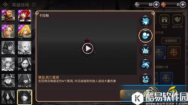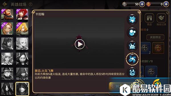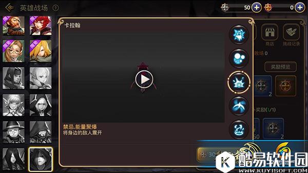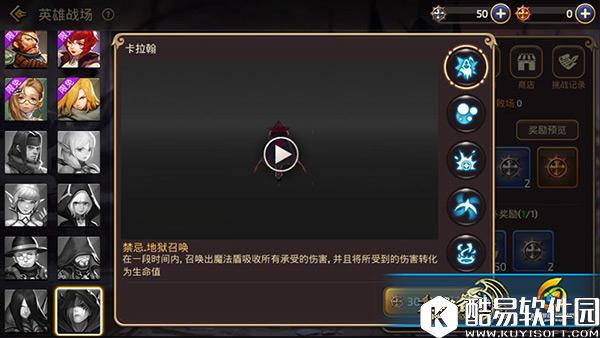 禁忌.地狱召唤:在一段时间内,召唤出魔法盾吸收所有承受的伤害,并且将所受到的伤害转化为生命值。 解析:在英雄战场中,玩家随时都在战斗在PK,卡拉翰作为一名法师英雄在这种多人混战中极易被击杀。但是该技能提供的护盾效果大大提升了卡拉翰的生存能力,最主要的是还能将受到的伤害转化为生命值,让卡拉翰拥有了不错的续航能力。