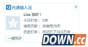 用户也可以点击输入法状态栏的人形图标按钮注册登陆,成为光速输入法用户,输入法会记录用户的打字字数与词组,看着每天打字字数越来越庞大,一定程度上也能满足网友们小小的虚荣心呢。