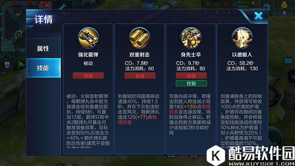 技能分析: 被动技能:强化霰弹 分析:被动技能让刘备可以通过普攻来提高自身双抗,而普攻发射的霰弹只有中央两颗弹丸可以产生暴击和触发装备效果,这就使得刘备越贴近对手输出打出的伤害就越高,所以玩家可以通过调整与敌人之间的距离来增加输出伤害。