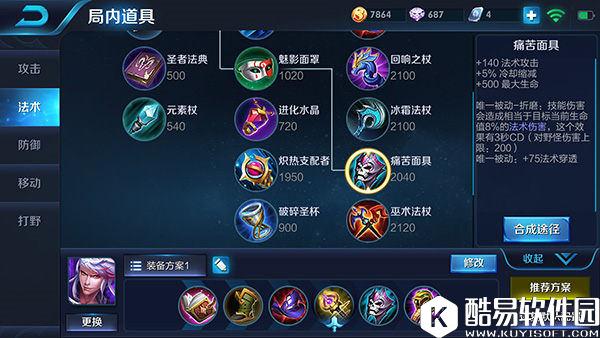 出装思路:本套出装以提升高渐离的输出伤害为主,利用法术吸血属性和月之守护来提高他的生存能力。第一件装备做出噬神之书有两点原因,第一点是此装备的法术吸血不仅让高渐离拥有了赖线的资本,而且配合大招的免伤效果一起使用更是强化了高渐离的生存能力;第二点是此装备的冷却缩减属性可以提高高渐离的技能释放频率。移速装的选择我们推荐出影忍之足或者抵抗之靴,前者提供的物理防御和减少15%普攻伤害的效果让高渐离前期不再惧怕敌方刺客型打野的骚扰;后者提供的韧性加成减少了高渐离被控制的时间,在面对偏控制阵容时十分有用。 中期的装备选择,我们推荐出博学者之怒+辉月的组合。毫无疑问,想要提高一个法师的爆发伤害一定做为他做出一件博学者之怒,利用此装备的毁灭被动,高渐离的法术攻击属性将得到大幅度的提升,这时候的他完全可以为队伍提供充足的AP输出。做出辉月的目的是为了避免高渐离过早的被敌人集火秒杀,当面对致命的控制或者伤害时一定要使用月之守护来化解危机。 为了保证高渐离后期的伤害可以威胁到敌方每一个人,我们推荐第五件装备出带有法术穿透属性的痛苦面具,而此装备的折磨被动还可以进一步提高高渐离大招持续输出伤害。最后一件装备我们推荐出梦魇之牙,可以有效针对敌方带有回复技能的英雄。