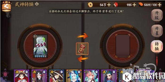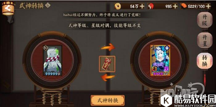 考虑到对于嘲讽类式神相关的御魂调整会影响到式神的使用,嘲讽类式神包括兵俑、狸猫和天邪鬼赤,补偿内容如下: 6星:1张6星式神转换券(时效30天) 5星:1张5星式神转换券(时效30天) 2、打开要转移的式神→育成,在升星下面有个转换。中间是放置式神转换符的,右边选择要换的式神 3、式神等级、星级对调,技能等级不变。(被调整的式神不影响,不相关) 4、确认之后。双方的星级和等级永久性的转换了。