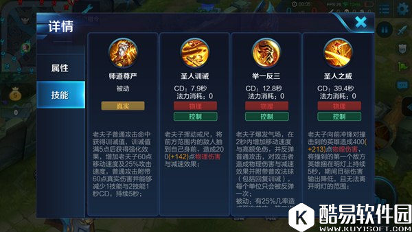 老夫子释放技能增加自身移动速度与高额免伤,并且反弹普通攻击,对攻击自身的敌方英雄造成物理伤害与减速效果,技能被动有几率造成两次普通攻击。该技能一般常用来老夫子抵抗敌方英雄的普通攻击和高额伤害,同时也是老夫子逃生一大利器。在残血撤退时释放这个技能有极强的逃生保障。