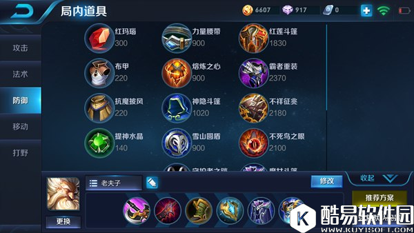 出装思路:巨人之握增加老夫子的最大生命,有利于老夫子在团战中的生存能力。末世增加了老夫子的物理攻击与攻击速度,可充分利用老夫子自身被动打出连续高额伤害,同时还增加了老夫子的物理吸血,为老夫子的续航增添保障,唯一被动破败使得老夫子普通攻击时,附带敌人当前生命值一定比例的伤害效果。影忍之足增加老夫子物理防御,为老夫子前期生存做基础。