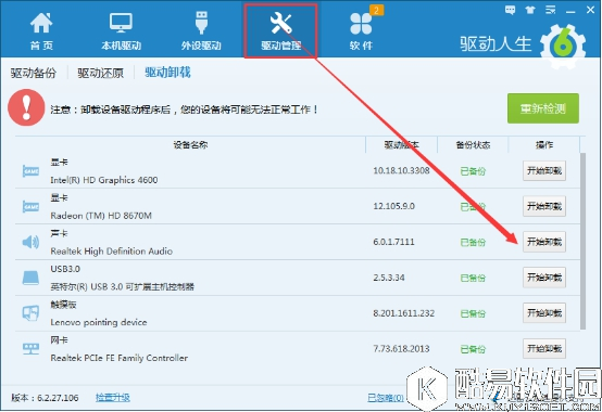 相信不少网友在用电脑播放视频或音乐时,遇到过声音异常,比如声音失真、忽然很大声、声音太小等情况。出现上面这类情况,一般有的是因为病毒导致,有的是声卡驱动出现异常、软件设置问题(主要是语音视频设置的声音输入、输出设置不正确)等。解决的方法很简单,学会常用的几种方法基本能搞定! 电脑声音异常出现的几种常见情况的解决方法: 首先,常见的声卡驱动问题,一般是没安装正确 只需要卸载现在的声卡驱动,重新下载最新的声卡重新安装看看。下面就给大家介绍下如何快捷正确的卸载和安装声卡驱动: 1、下载安装驱动人生最新版本,点击驱动管理(如下图),一键检测查看,可查看到你本机的声卡驱动,点击右边驱动卸载,即可一键彻底卸载干净,然后点击立即重启即可。