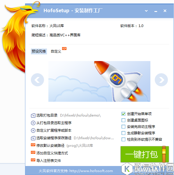HofoSetup(安装制作工厂)本文将教大家如何把开发好的软件打包成EXE安装程序, 这也是每个程序员必须具备的基础知识。 制作安装程序有两种方式:自已编写安装程序 2. 用已有安装程序制作工具直接打包成EXE,一般我们会都选第2种方式,除了简单之外,最主要是高效。那么使用什么工具制作比较好呢?早期我们用过Visual Studio自带的打包功能, 后来又被Inno Setup和NSIS等工具取代,因为这两个工具使用更为灵活,今天我们使用的工具是HofoSetup(安装制作工厂),这款工具操作更为简单,而且安装界面效果非常好,较为符合现代软件的要求。下面我们一起学习如何使用 HofoSetup 制作出精美的安装程序。 第1步:填写和选择基本的软件信息