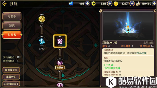 【50级】 50级第一个EX技能:踢射EX——踢射技能是一个向前将对手击飞踢到空中的一个技能,破霸体的能力稍弱,作为连招使用控制不错,EX强化后,变成了向前快速移动一段距离再踢飞。这个技能的自带霸体比较弱,对手随便放一个技能都可以打断踢射EX,但是如果是对手在走位想拉开距离的情况下,一个踢射可以直接拉进很大的距离,再配合翻滚螺旋踢,直接跨越半个地图追击敌人有木有???所以这个技能实际应用效果不在于和对手见招拆招,而在于战略性意义。举个例子,当一个剑圣、贤者追着你打的时候,你没有任何解控了,怎么办呢?可以直接踢射加星云锁链拉开半个地图的距离,对手只能望人兴叹了~而有时候影舞者遇到学者职业跑图或者箭神职业拉开距离,一个踢射EX直接拉进距离,这时候对手一个翻滚匆匆忙忙交出来,你就可以用你螺旋踢进行追击,非常的有可塑性和娱乐性。但是总体来说踢射EX技能偏弱势,比起箭雨或者多段又或者爆裂踢,相对鸡肋,喜欢的同学可以带着玩。而PVE当中,踢射伤害还算能看,但是由于容易踢过头(boss体型小)造成伤害打不完整,就很难受,所以副本并不推荐使用。