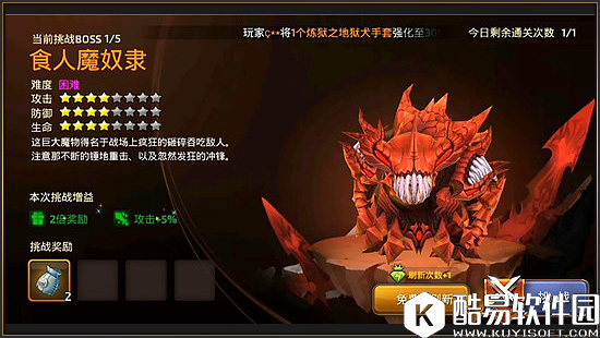 食人魔奴隶本是深渊玩法的最终Boss,无奈在深渊玩法中一直被4位小伙伴们血虐,在本玩法中食人魔奴隶终于有机会与我们展开一场1V1的公平对决。在食人魔奴隶Boss困难难度下,Boss的攻击力,防御力以及生命值都为四星,挑战难度中等,相信对于我们来说挑战之旅依旧轻松,下面就让我们进入与食人魔奴隶的实战吧! 【食人魔奴隶技能招式①:冲锋】