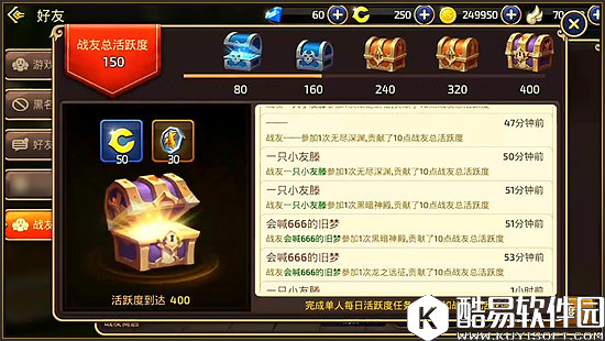 除了小伙伴们日常活跃值奖励系统之外,结为战友之后还有战友专属活跃奖励等着我们获得。战友奖励机制中的活跃值为4位队员所共享,当4位队员的活跃值累计达到80,160,240,320,400点的时候,都可以开启专属战友宝箱,以400点宝箱为例,我们能够开启获得50龙币以及30战友币,奖励还是非常丰厚的。 【专属战友商店】