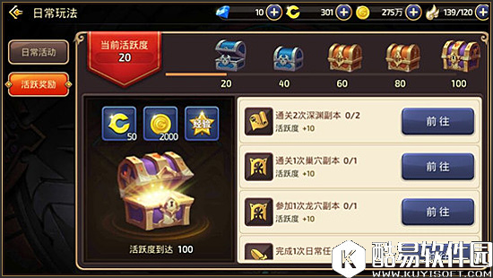 在龙之谷中,如果我们拥有一定的钻石,但是没有龙币的话,那么我们也是可以直接利用这个钻石来换取龙币的。不过个人还是不推荐这样兑换的,性价比不高,但是对于一些大R玩家的话,那么自然也是获取龙币的首选了,而这个钻石,目前也是需要充值才能得到,属于氪金一类的获得方式。 3.活跃宝箱 性价比:★★★☆☆