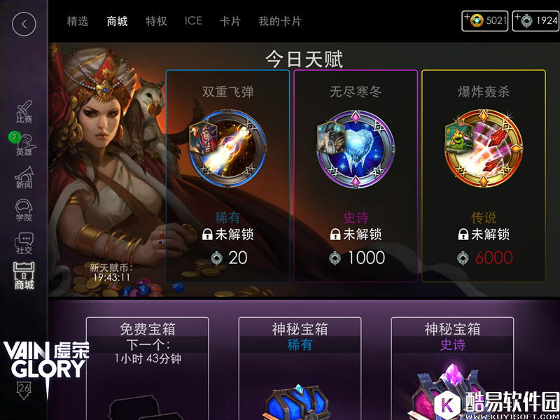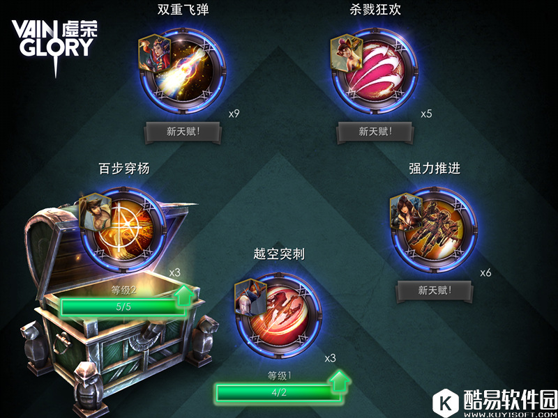 【最任性的“姿势”:稀有史诗传说,每天三款随心换!】 除了上述的任务宝箱,玩家还可以使用游戏内的免费货币——荣耀,直接在商城中购买天赋币。《虚荣》每天推出3款不同等级的天赋供玩家使用荣耀购买。每天可供购买的天赋币数量为:稀有天赋,60枚天赋币;史诗天赋,10枚天赋币;传说天赋,4枚天赋币。天赋币可供购买的数量差异,或许与不同天赋可升级的等级上限有关,稀有天赋最多可升级20级,史诗天赋最多可升级10级,而传说天赋最多可升级5级。