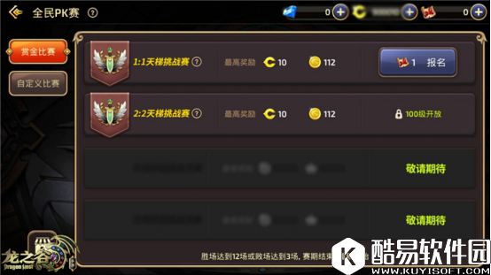 两种模式规则各有不同 想要参加全民PK赛,玩家只需进入竞技界面的“全民PK赛”,消耗钻石、龙币等购买门票后即可参加赏金模式。官方赛每种玩法下均有最低参与人数限制,若玩家报名数达不到要求,则已报名的玩家不能进行匹配对战。玩家进入比赛后,参战界面上将实时更新玩家的挑战进度、获胜场数和可得奖励等信息。当玩家获胜12场或失败3场后,就会被退出比赛并可领得奖励。
