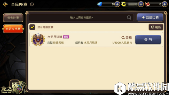 在自定义模式中,玩家可以消耗龙币创建比赛,自定义比赛规模、比赛时长,限定参加人群类别、玩法模式等。另外,玩家还可以通过分享设置密码,邀请限定人群外的其他玩家一起参加。在该模式下,创建者拥有提前开赛、修改房间密码等权限,而非创建者则可以在不获得任何奖励的设定下随意退出。玩家一方面可以通过查询,搜索对应的PK赛,另一方面还可以在随机推送的比赛中进行挑选,选择心仪的PK赛一试身手。