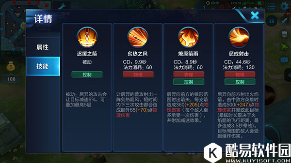 技能解析: 被动-迟缓之箭: 后羿的被动是一个控制技能,在我们攻击到敌人时会让目标减速,一共可以叠加5层,5层之后就是30%的减速,配合上一技能可以快速的叠满被动,在前期对线还是很强势的,敌方英雄走位不慎的话,前期配合辅助以可以轻松的拿下一血。