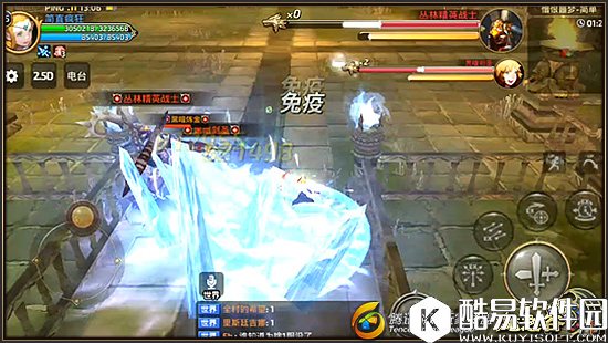 在黑暗元素向我们靠近时,会释放大范围的“冰刺”技能,我们通过上图能够看到,冰刺技能呈范围较大的圆形区域,而且我们一旦被其命中,还会受到短暂性的减速效果,躲避其他技能招式将会变得更加困难,很容易让黑暗炼金以及黑暗剑圣趁此空隙对我们进行攻击。 所以躲避这个技能还是非常有必要的,由于黑暗职业Boss的技能招式并没有范围提示,如何进行预判将其躲避十分重要。“冰刺”技能是黑暗元素的近距离技能招式,这就是说Boss要想释放本技能,就会特意的来到我们的身边,因此我们就可以观察黑暗元素的动作进行预判,在“冰刺”技能释放时,找准时机使用闪避技能将其免疫。 【黑暗元素的棘手技能:冰冻】