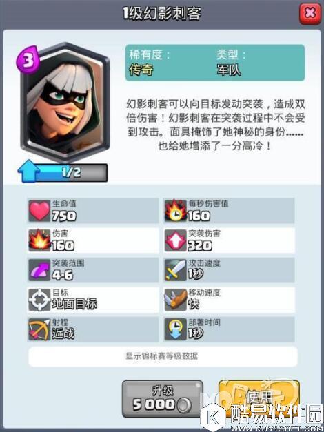 幻影刺客: 卡牌解析: 幻影刺客是一张3费的史诗卡牌,这张卡有着非常不错的冲锋能力,在敌方4-6格的范围内即可快速的冲锋来打出双倍的伤害,并且没有冷却时间,同时这张卡牌在血量上也是较为不错的,输出一张突击能力非常强的卡牌,并且进攻性大于防守能力。 搭配卡牌: 毒药法术/复仇滚木/掘地矿工/皮卡超人,幻影刺客的优点在于有着非常快速的突击和冲锋伤害,在搭配皮卡超人或矿工时,当他们吸引敌方公主塔后,那么幻影刺客可以进行快速的冲锋输出,而由于幻影刺客比较害怕一些人海卡,所以利用毒药法术或者复仇滚木来进行辅助则是更好的。