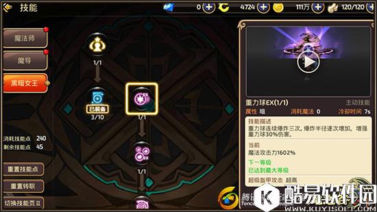【50级】 50级第一个EX技能:重力球EX——重力球是一个召唤一个魔法球飞出去在远处爆炸的一个技能,造成范围伤害和硬直效果,EX强化之后,重力球可以连续爆炸三次,攻击范围每次都比前一次更大,整体伤害也还算可以。PK当中由于方向的问题,一般情况比较难命中目标,多数女王玩家不会选择使用它去参与PVP,而是PVE的更多。由于技能CD短,所以循环输出还是不错的,推荐PVE使用。