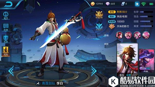 宫本武藏的被动技能是和宗师之力被动强击差不多的效果,并且还会减少所有技能的冷却时间,增加了宫本武藏的持续输出能力;一技能空明斩是一个神技,除了会对敌人造成伤害之外,还能挡住所有弹道技能,对射手和法师来说就是噩梦,并且一技能命中敌方英雄后还会回复自身生命值,提高了宫本武藏的续航能力;二技能是一个位移技能,会对敌人造成伤害,穿过敌人后还会生成一个护盾并返还一半冷却时间,也是宫本武藏能秀起来的原因;三技能是一个强控输出并且附带BUFF的技能,一般作为先手使用,有大招BUFF的宫本武藏是无敌的。宫本武藏的基本使用技巧是,先用一技能消耗,当把敌人生命值消耗到一半左右,对敌人释放大招,将其一套带走。或者支援队友时直接大招控住敌人,让队友先输出。 青莲剑仙——李白 李白可谓是王者荣耀中人气最高的英雄,不说别的,单一个帅字就够了,但李白有的不仅仅是颜值,英雄自身的技能也非常厉害。