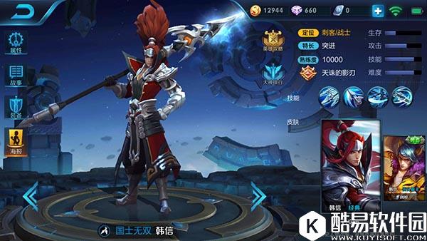李白的被动技能可以说是对李白的一个限制,必须连续四次普通攻击后才能解锁三技能,并且只有5秒时间,虽然会提升5%的攻击力,但是跟能直接使用三技能相比,相信大家宁愿不要这点攻击力吧,但是反过来想想,没有这层限制的李白,虽然厉害,却没有多少可玩性了;一技能是李白的位移技能及控制技能,两段突进,命中敌人会将敌人晕眩,第三段还可以回到原位,单这个一技能,只要李白不作死就一定不会死;二技能是一个AOE技能,附带减速效果,且释放二技能时的李白不会被选中;三技能就厉害了,超高的AOE攻击,并且释放时无敌,冷却时间只有短短的12秒,现在想想没有被动限制的李白有多恐怖了吧。 李白的基本使用技巧是,由于被动的限制,李白必须时时刻刻通过刷兵线或者野怪来刷被动,刷完后一技能冲入敌方人群迅速释放二技能和三技能,结束后再一技能回到原地,敌人根本反应不过来。 国士无双——韩信 韩信是一个具有三段远距离位移的男人,只要想跑基本上没人能抓到他。