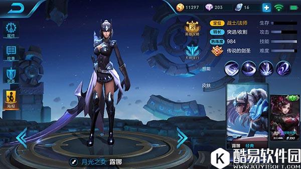 韩信的被动是第四次普通攻击会挑飞目标,技能命中敌人会提供50%的攻速加成,配合上攻速装,基本上敌人一秒就会被击飞一次;一技能承包了韩信三段位移中的两段,命中敌人后还会挑飞目标,又是一个控制技能;二技能是三段位移的最后一段,但是二技能使用时一定要注意朝反方向释放;三技能是一个AOE技能,释放时是霸体状态,最后一段攻击也能击飞目标。韩信单挑能力很强,但是团战能力很弱。基本使用技巧是,前期刷野发育,找机会GANK,中后期不要参加团战,跟队友四一分推,如果发现敌人从地图上消失就注意周围动态,一旦敌人出现就立刻逃跑,没人追得上,或者寻找敌方走位失误时机,一旦发现有人落单,直接一套技能把他秒掉。 月光之女——露娜 露娜是一个冷傲女神,但玩家们喜欢的却不是她的外表,而是她强大的收割能力。很多人都以为露娜的定位是法师,恰恰相反,她的主定位是一名战士,也是王者荣耀中唯一一个主定位是战士的法师。