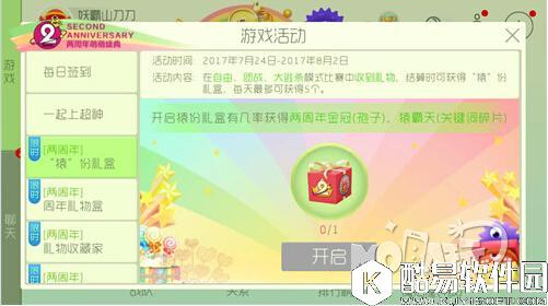 活动时间:2017.7.24~2017.8.2 活动内容:在自由、团战、大逃杀模式比赛中收到礼物,结算时可获得猿份礼盒,每天最多可得5个。 周年礼物盒