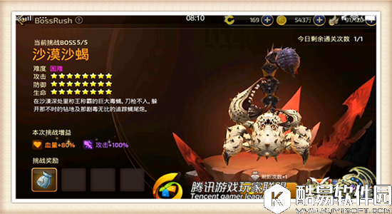 第五关卡困难难度的Boss所有属性都是满星状态,沙漠沙蝎Boss亦是如此,因此各位谷民在挑战的过程中千万不能掉以轻心。在本局挑战中我获得的Buff增益还是非常不错的,血量增加了80%能够大幅度提升我们的生存能力,而攻击力整整提升了一倍能够大幅度的减少我们通关所用的时间。在开局如此有利的情况下为各位谷民的通关创下了极其有利的条件。 【沙漠沙蝎技能招式:剧毒之球】
