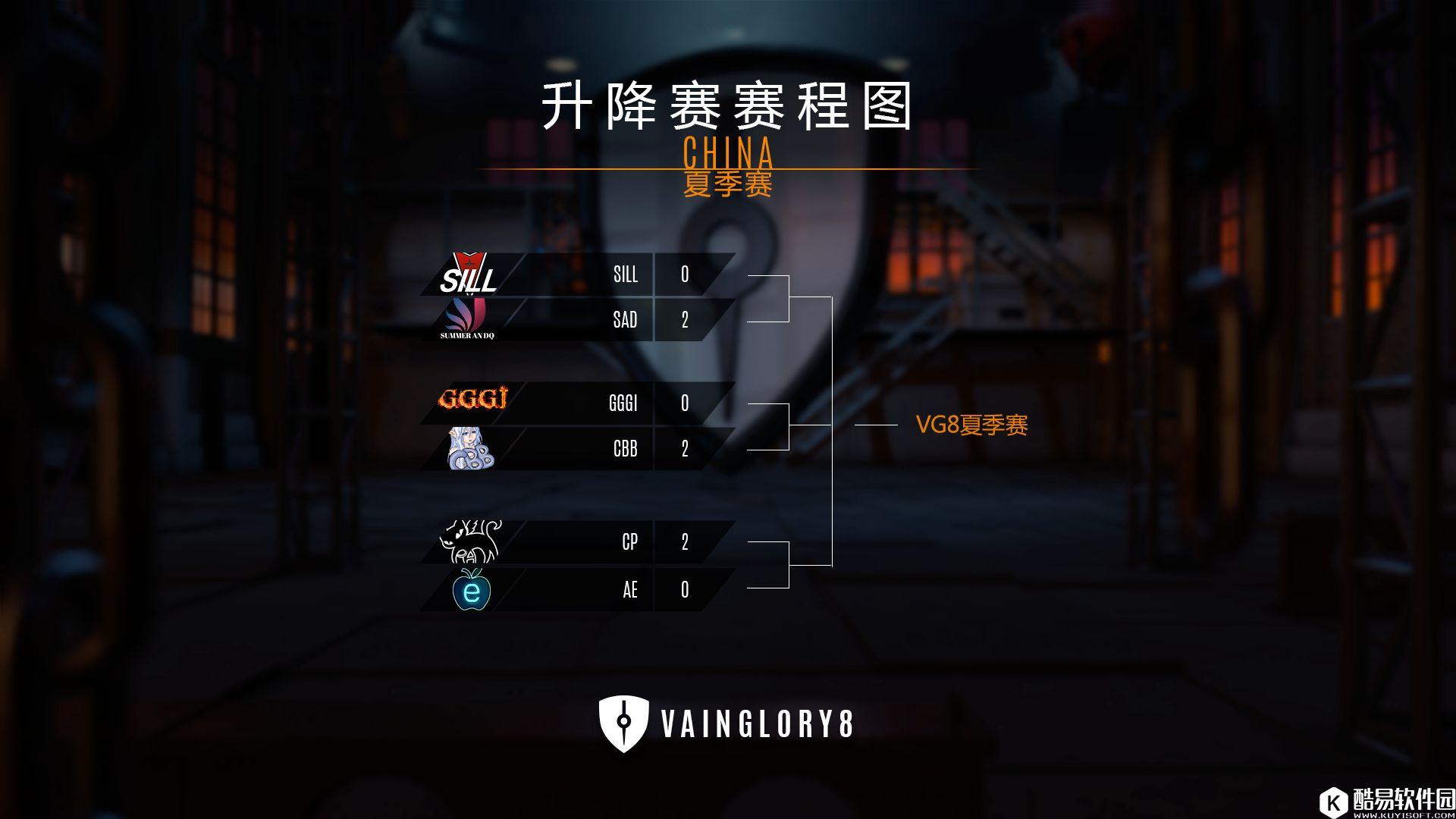 【升降赛结束 CBB携手SAD双双晋级】 随着VCL比赛的结束,本周三支VCL的优胜队伍正式开始了对VG8队伍的挑战。SAD首先对阵在VG8中一局未胜的SILL,并且以2:0的比分轻松将SILL淘汰晋级。之后同样在VG8中一局未胜的GGGI也落败于CBB。然而VCL的冠军AE遇上了VG8中实力稍强的CP就没那么好运了,CP以2:0的局数保住了自己在VG8的位置。鉴于AE在VCL上曾经两度力压CBB,看样子在接下来的VG8赛程中,幸运晋级的CBB和SAD都要好好修炼一番,避免落入SILL和GGGI的境地了。