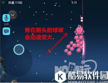 当我们吞吃了刺球,或者分裂了很多次之后,我们就有了一大群小球,这个时候必须快速合球才能保证不被大球吞噬,所以所有球球朝着同一方向移动,同时吐泡泡就是非常快速的合球方法了。 第一步,控制球群移动使得所有球球距离不远。第二步就是控制所有球球朝着一个方向移动,然后开始吐泡泡,这样排在队伍最前面的的球球就会迅速变大,合球就成功了。这样的方法不仅适用于大群球球,只有少数几个球球也可以这样快速合球。而我们只有少数几个球球要合体的时候,中心合球法经常不管用,必须使用这个方法才能快速合球。 技巧三:沿着墙边吐泡泡快速合球
