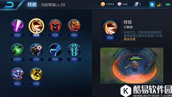 一技能:狂飙突进 钟无艳向前突进,下一次普通攻击替换为重击造成物理伤害与减速效果。 分析:一技能是钟无艳的位移技能,同时拥有着可观的伤害和减速效果,可以用来快速接近敌人或者撤退,对线时消耗也是极好的。 二技能:震慑打击 钟无艳大锤蓄力后猛击地面,对范围内的敌人造成物理伤害,对大锤命中中心的敌方单位造成双倍伤害并附带50%减速持续2秒。 分析:二技能的输出很高,但由于需要蓄力,所以很容易被敌人躲掉,最好是在触发被动效果将敌人石化后再使用,二技能对命中中心的敌人还会造成双倍伤害,附带的减速效果会让敌人难以逃脱。 三技能:飓风之锤 钟无艳快速旋转大锤,对范围内的敌人每段打击造成物理伤害;被动:钟无艳召唤大地之力,每3秒获得一个岩土护盾,护盾永久存在。 分析:三技能是一个AOE技能,团战时可以打出爆炸的伤害,是钟无艳的主要输出技能,配合上钟无艳的被动,更是可以达到团控的效果,团战收益非常高。 召唤师技能选择:终结