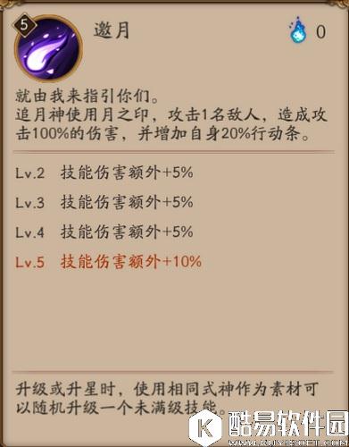 【邀月】:追月神使用月之印,攻击1名敌人,造成攻击100%的伤害,并增加自身20%行动条 点评:普攻,附带自拉功能,没有写触发概率,应该是100%几率拉自己20%的行动条,很实用的普攻