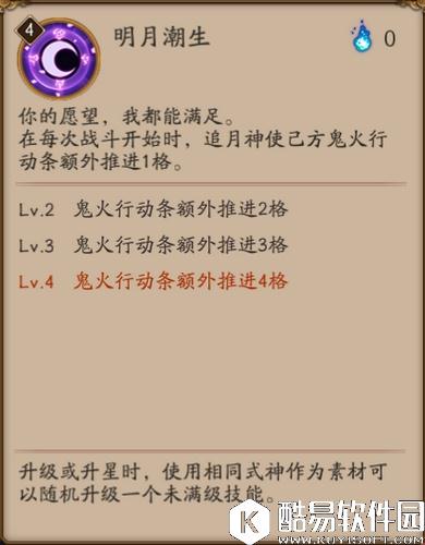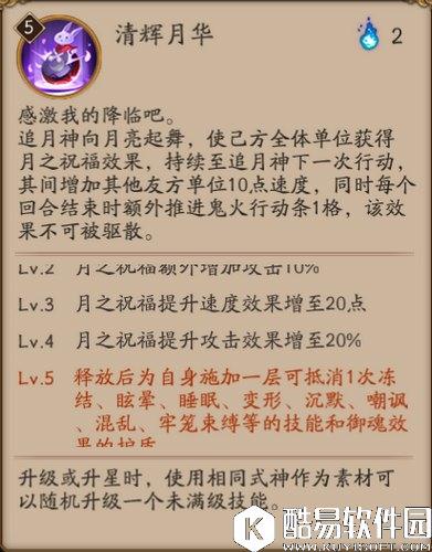 【明月潮生】:每次战斗开始时,追月神使己方鬼火行动条额外推进1格,满级4格。 点评:被动,相当于自带火灵