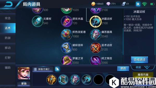 第一件选择近卫荣耀,提供生命值以及移速,提高了孙膑前期的生存能力以及线上支援能力,被动为附近的友军,增加物理攻击以及法术伤害,提高了团队的输出能力,同时另一个被动,也可以保证自身的发育不会落下太多。抵抗之靴增加法术防御使孙膑可以抗住更多的法术伤害,被动增加的韧性以及移速提高了孙膑的机动性。 中期:痛苦面具+冰霜法杖