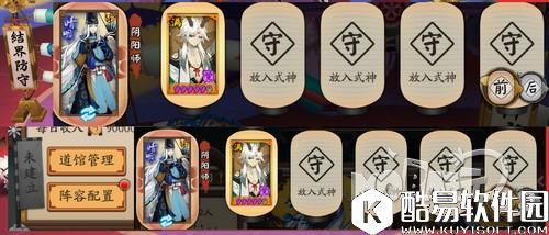 同时防守胜率极高的玩家会获得大结界师称号,连胜次数较多的馆主也会获得称号。 道馆阵容 在实装道馆系统后,结界防守新增了“前后”两页,玩家最多可以上阵十名式神,但是在正常的结界突破中,用到的还是“前”这页的五名式神。 同时另一个比较关键的点是,改版后寮防守阵容就是结界防守阵容。虽然在道馆界面中有独立的阵容调整按钮,但是点进去后显示的阵容就是结界中设置的结界防守阵容。