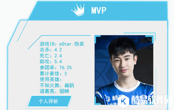 在比赛一开始其实eStar战队是并不占优势的,第一局比赛是EDG.M战队赢得开门红,一路碾压eStar战队最终获得比分。但是意想不到的是后四局,eStar奋起直追,输掉了第一局好像并没有影响他们的心态,整个团队也意识到应该要保持好的心态,不能着急,稳定的打好每一场比赛。 这次eStar的伪装获得了MVP的称号,这次的称号当之无愧,因为比赛是和队员的默契配合,充分的打出了前期的优势,所以在整局比赛中发挥的很亮眼。希望可以继续保持下去,下一次的比赛希望每个成员都要加油。