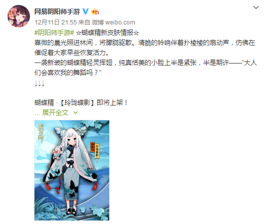 小编刚刚在阴阳师的官网上看到了一则好消息,就着赶紧来和你们分享。阴阳师的官微曝光了R级别式神蝴蝶精的新皮肤“玲珑蝶影”。喜欢这个式神的玩家千万不要错过新皮肤的上线时间哦!
