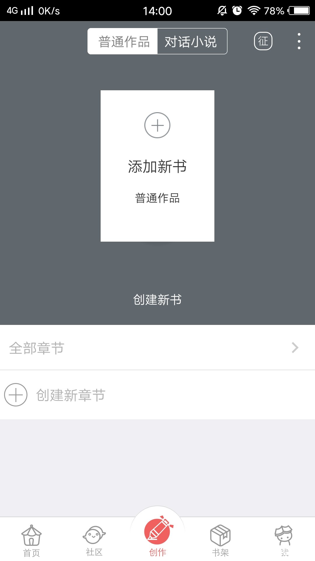 小编首先给你们介绍一下这款软件究竟怎么创造小说?首先打开软件,屏幕下方的功能有一个创作的字样,所以点击它就可以了,再点击添加新书可以自己选择封面图以及作品恶名称、标签以及简介,输入好了之后就可以开始创作之路了。